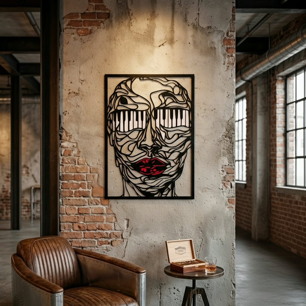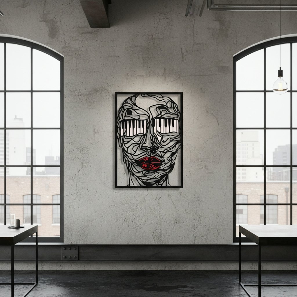 El sonido del alma. Descubre una pieza única que captura la esencia musical del pensamiento humano: una imagen abstracta de una cabeza con ojos en forma de piano. Este diseño inspira conexiones entre la música, las emociones y los sentidos, evocando un viaje introspectivo hacia el alma misma.