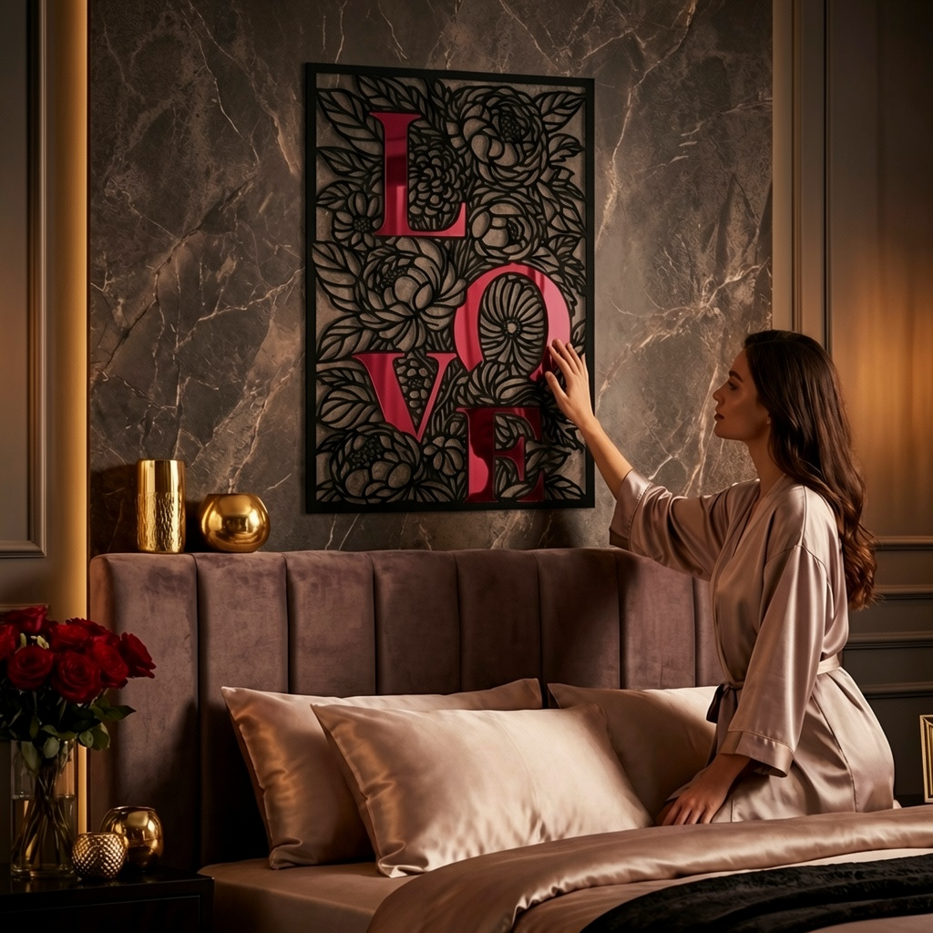 Decoración de Pared de Madera Cortada a Láser LOVE con Flores – Panel Decorativo